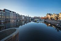 Het is nog vroeg op een zonnige novemberdag in Amsterdam. De grachtenpanden aan het Damrak ontvangen de eerste zonnestralen. Op het vrijwel rimpelloze water weerkaatsen de karakteristieke gevels.