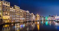 Damrak Amsterdam tijdens het Amsterdam Light Festival 2015. Deze foto is genomen wat later op de avond, voorbij het blue hour en de lucht kleurt al behoorlijk donker, maar wordt nog opgelicht door de stadsverlichting. Een moment zonder rondvaartboten maakt het water rustig en geeft het plaatje alle ruimte.