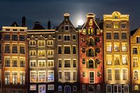 Dansende huizen aan het Amsterdamse Damrak. De maan komt net op in de nacht.