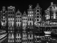 Laat in de avond, begin van de nacht worden de grachtenpanden aan het Damrak verlicht. De rondvaartboten dobberen op het stille water, wat een prachtige spiegeling van de grachtenpanden geeft.