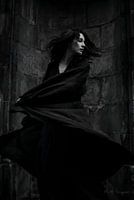 Een moment van verstilde beweging. Dit zwart-wit kunstwerk vangt de rauwe elegantie van een draaiende figuur, gehuld in donkere stoffen die om haar heen zwieren als rook.