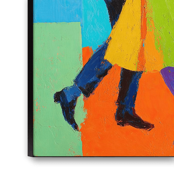 Dance Moment - Dit schilderij toont een vrouw met een vrolijke groene rok die in een liefdevolle dans met een man verwikkeld is, tegen een achtergrond van felle, kleurrijke vlakken in pastel- en primaire tinten die een energiek gevoel uitstralen.