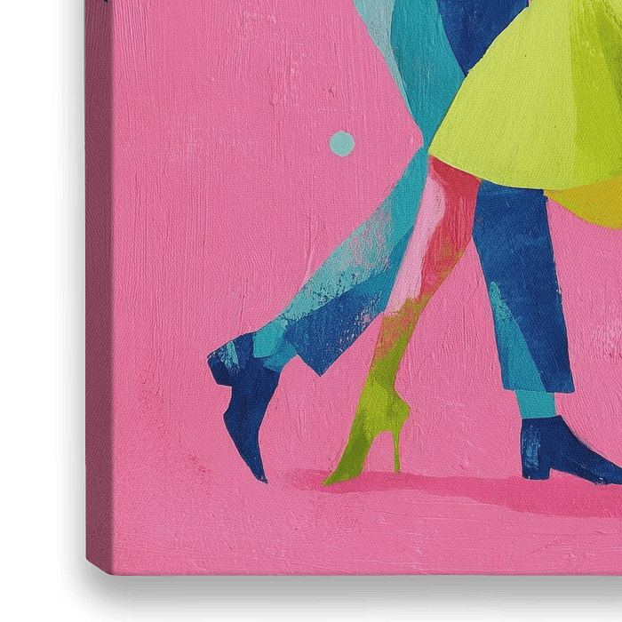 Dance Vibes - Dit is een dans schilderij waarin een vrouw in een heldere gele jurk en een man in een blauw kostuum met elkaar dansen tegen een levendige roze achtergrond, met speelse stippen die de energie van de dans vergroten.