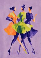 Dance Vibes - Dit dans schilderij toont drie vrouwen in kleurrijke jurken, met opvallende oranje, groene en paarse tinten die beweging en energie uitstralen tegen een zachte lila achtergrond.