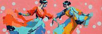 Dance Vibes - Dit is een kleurrijk dans schilderij met twee vrouwen in levendige outfits die energiek bewegen op een achtergrond van zachte roze, waarbij de felle kleuren van hun kleding in contrast staan met de grote, witte cirkels die het geheel opvrolijken.