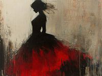 Dance in Crimson Echoes - Dit vrouwen schilderij toont een elegant silhouet van een vrouw in een weelderige, rode jurk tegen een abstracte, neutraal gekleurde achtergrond, waarbij de dramatische, vloeiende textuur van de jurk de aandacht trekt en een gevoel van beweging en passie oproept dat doet denken aan de flamboyante sfeer van de Moulin Rouge.