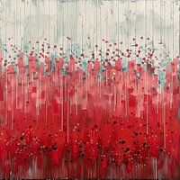 Dance of Colors in Storm - Dit abstracte schilderij toont een vibrante explosie van rode en witte verfspatten tegen een contrasterende grijze achtergrond die een gevoel van beweging en emotie uitstraalt.