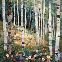 Dance of Colors in the Woods - Dit alpiene bos schilderij onthult een kleurrijk bloemenveld omgeven door statige witte berken tegen een levendige achtergrond van herfstbladeren.