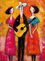 Dancing Colors - Dit vrolijke schilderij toont een man met een gitaar omringd door twee vrouwen, waarbij de levendige kleuren geel, roze en oranje de soepele lijnen en speelse gezichten accentueren.