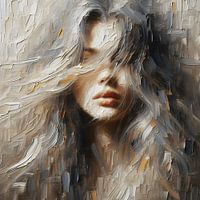 Stap binnen in de wereld van dit prachtige olieverfportret van een vrouw met lang haar, gedrapeerd in wit en goud. Haar lokken lijken te dansen op het doek, vol elegantie en tijdloze schoonheid. Dit werk brengt haar kracht en charme tot leven, waardoor dit werk een betoverende aanvulling is op elke ruimte. Laat je meeslepen door haar…