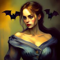In "Dancing in the Dark," een digitaal olieverf effect kunstwerk, komt de duistere en mysterieuze sfeer van Halloween tot leven. Het doek toont een enigmatische vrouw, gehuld in een lange, wapperende jurk die lijkt te versmelten met de schaduwen. Haar lange, golvende haren omlijsten haar gezicht als een donker gordijn. Maar wat dit werk echt betoverend maakt, zijn de twee vleermuizen.