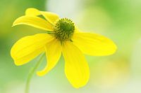 Een close-up van een gele bloeiende bloem tegen een zachte geel/groen gekleurde achtergrond.