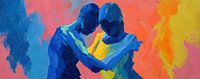 Dancing in Vibrant Hues - Dit kleurrijke dans schilderij toont twee figuren die elkaar omarmen, met opvallende blauwe en gele tinten tegen een levendige achtergrond van roze en geel, wat een gevoel van energie en verbinding oproept.