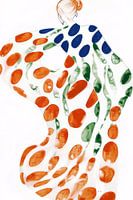 Kleurrijk abstract schilderij van dansende vrouw in blauw, oranje en groen gestippelde bohemian jurk op lichte achtergrond.