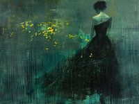 Dancing in the Solitary Night - Dit surrealistische schilderij toont een vrouwelijk silhouet in een donkere jurk, tegen een mysterieus blauwgroen achtergrond met oplichtende gele bloemen.