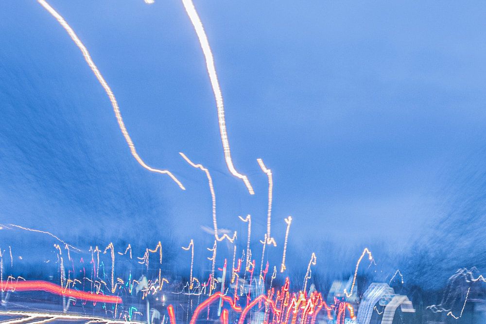 Door tijdens het autorijden een lange sluitertijd te gebruiken werden de lampen van de andere auto's dansende lijnen wat een abstract beeld geeft