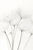 Een ingetogen zwart-wit fotografische studie van paardenbloempluizen die als verfijnde dansers tegen een lichte achtergrond zweven. De delicate lijnen van de zaden creëren een subtiel spel van licht en schaduw, waarbij de ragfijne structuren een bijna abstracte compositie vormen die rust en lichtheid uitstraalt.