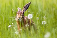 Een bruine haas zit in een zomerweide en snoept van paardenbloemen.