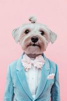 Met zijn charmante, warrige vacht en alerte, ronde ogen straalt deze Dandie Dinmont Terrier een onmiskenbare elegantie uit. De vrolijke kerel in zijn pastelblauwe pak, versierd met een mooi strikje, doet denken aan een kleine gentleman die klaar is om de wereld te veroveren met zijn charme. Een echte geportretteerde knipoog!