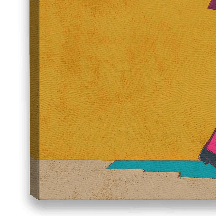 Dans Kleur | Dance Connection - Dit is een dans schilderij waarin een vrouw in een levendige roze jurk met een hoed en een man in een opvallend geel jasje met een hoed, intiem samen dansen tegen een kleurrijke achtergrond van geel en turquoise.