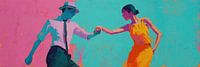 Dans Vrouw | Dance Together - Dit energieke schilderij toont een vrouw in een opvallende gele jurk die een danspartner, gekleed in een witte overhemden met een hoed, vastpakt, terwijl de achtergrond een levendige combinatie van roze en turquoise tinten heeft.