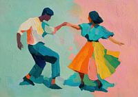 Dans Vrouw | Swinging into Joyful Moments - Dit dans schilderij toont een energieke vrouw in een felgekleurde rok die vrolijk danst met een man, waarbij de frisse kleuren en dynamische bewegingen de levendigheid van het moment vastleggen.