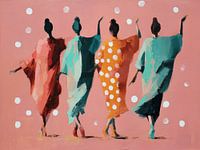 Dans Vrouwen | Dance Party - Dit schilderij toont vier dansende vrouwen in levendige, kleurrijke outfits, met opvallende stippen op de achtergrond en een vrolijke, roze tint die een gevoel van energie en vrolijkheid oproept, ideaal voor een modern interieur.