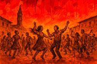 Dit kunstwerk is door mij vervaardigd met digitale technieken, waarbij ik bewust heb gekozen voor een olieverfschilderachtige stijl. Het toont een levendig plein waar mensen in volle overgave dansen onder een dramatische, rode lucht. De warme tinten en krachtige penseelstreken roepen de intensiteit van een zinderende zomeravond op,…