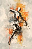 Dans in Kleur - Op dit abstract schilderij zie je een dynamische figuur die lijkt te dansen, met een krachtige beweging en opvallende oranje en zwart tegen een lichte achtergrond.
