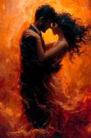 Hier zijn de geliefden afgebeeld in een tijdloos moment, omgeven door een storm van kleur en emotie. Het is een krachtige representatie van liefde en verbondenheid, ideaal voor een centrale plaats in een ruimte bedoeld voor samenkomst en viering van relaties.