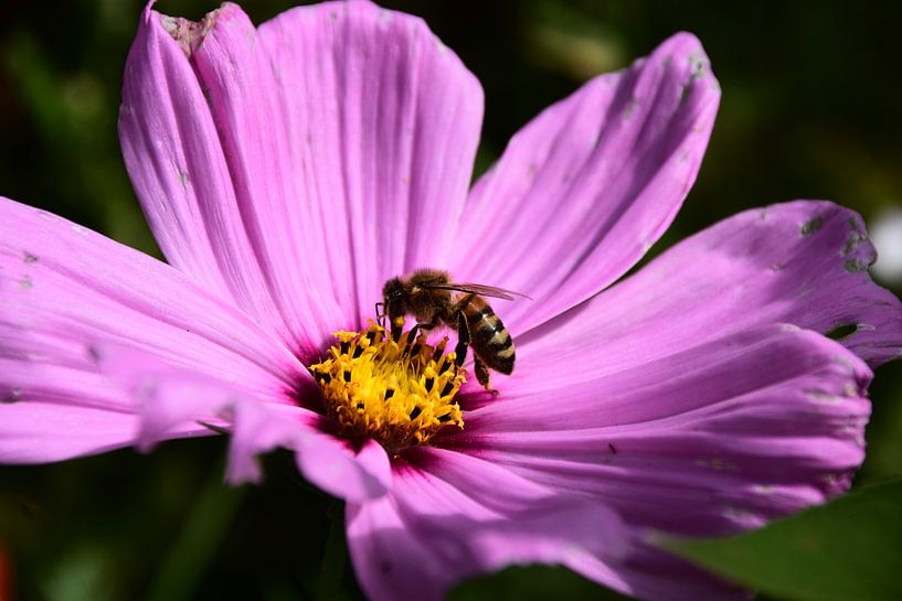 In het warme zonlicht rust een bij op een delicate bloem. Tussen stuifmeel en een zacht kleurenspel ontstaat een stil moment vol zomer en leven.