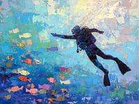 Dit prachtige kunstwerk toont een duiker in volledige uitrusting die zich gewichtloos lijkt te bewegen in een kleurrijke onderwaterwereld.