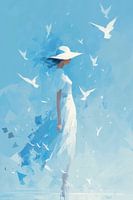 Een compositie in zachte blauwtinten waarin een sierlijke figuur in een witte jurk en hoed wordt omringd door vliegende duiven. Het kunstwerk straalt een gevoel van vrijheid en sereniteit uit, waarbij de losse penseelstreken en fragmenterende vormen een dromerige sfeer creëren tegen een lichte hemelachtige achtergrond.