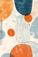 Dit werk toont een speelse dans van cirkels en lijnen in een palet van oranje, blauw en beige. De diverse texturen en patronen voegen diepte en dimensie toe, terwijl de kleuren samen een gevoel van vreugde en energie uitstralen.