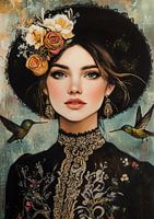 Een majestueus portret dat de sierlijke elegantie en natuurlijke schoonheid van een vrouw combineert met de betoverende beweging van kolibries. De vrouw staat centraal in het schilderij, gehuld in een verfijnde zwarte blouse met gouden stiksels die subtiel schitteren rond haar hals en langs de sluiting aan de voorkant. De blouse is rijkelijk versierd met prachtige, kleurrijke bloemen die lijken te bloeien vanuit het textiel zelf, een levendige symfonie van kleuren die contrasteert met de donkere stof.
