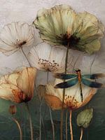 In dit dromerige digitale kunstwerk rust een libelle op tere, bijna transparante bloemen die herinneren aan een vergankelijk moment in de natuur. De fijne lijnen, subtiele kleuren en verweerde textuur geven het geheel een nostalgische, haast poëtische sfeer. Een ode aan stilte, schoonheid en de magie van het kleine.