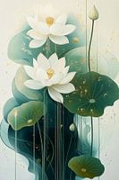 Een betoverend digitaal kunstwerk dat witte lotusbloemen in volle bloei toont tegen een achtergrond van diepgroene lotusbladen. De compositie wordt verrijkt door subtiele gouden accenten die als lichtdeeltjes door het beeld dansen, terwijl de zachte turquoise kleurschakeringen een dromerige sfeer creëren. Het minimalistische ontwerp straalt zowel kracht als delicatesse uit, waarbij de verticale lijnen van de stengels een elegant contrast vormen met de ronde bladeren.