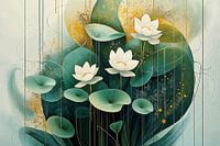 Een betoverend digitaal kunstwerk waarin witte lotusbloemen elegant oprijzen tussen turquoise waterleliebladeren. De compositie wordt verrijkt door subtiele gouden accenten en een mysterieuze mistige atmosfeer, wat resulteert in een hedendaagse interpretatie van traditionele Aziatische kunstmotieven. De zachte kleurovergang van diep turquoise naar lichte pasteltinten creëert een serene, meditatieve sfeer.