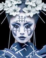 Het haar van de geisha is strak naar achteren gekamd, geaccentueerd door elegante witte bloemen die als artistieke ornamenten uit haar hoofd lijken te groeien. Deze bloemenaccenten staan in schril contrast met de strenge, lineaire vormen van haar make-up en benadrukken de wisselwerking tussen natuur en kunstmatigheid. De kimono die ze draagt is subtiel maar krachtig - donkerblauw, versierd met witte symbolen die doen denken aan kalligrafie.