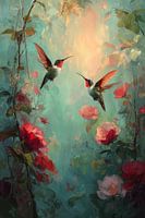 Een betoverend kunstwerk waarin twee kolibries gracieus zweven tussen weelderige rozen in verschillende tinten rood en roze. De achtergrond baadt in een dromerige turquoise gloed met zachte, warme accenten. De compositie straalt een serene energie uit waarbij de dynamische beweging van de vogels prachtig contrasteert met de rustgevende bloemenweelde.