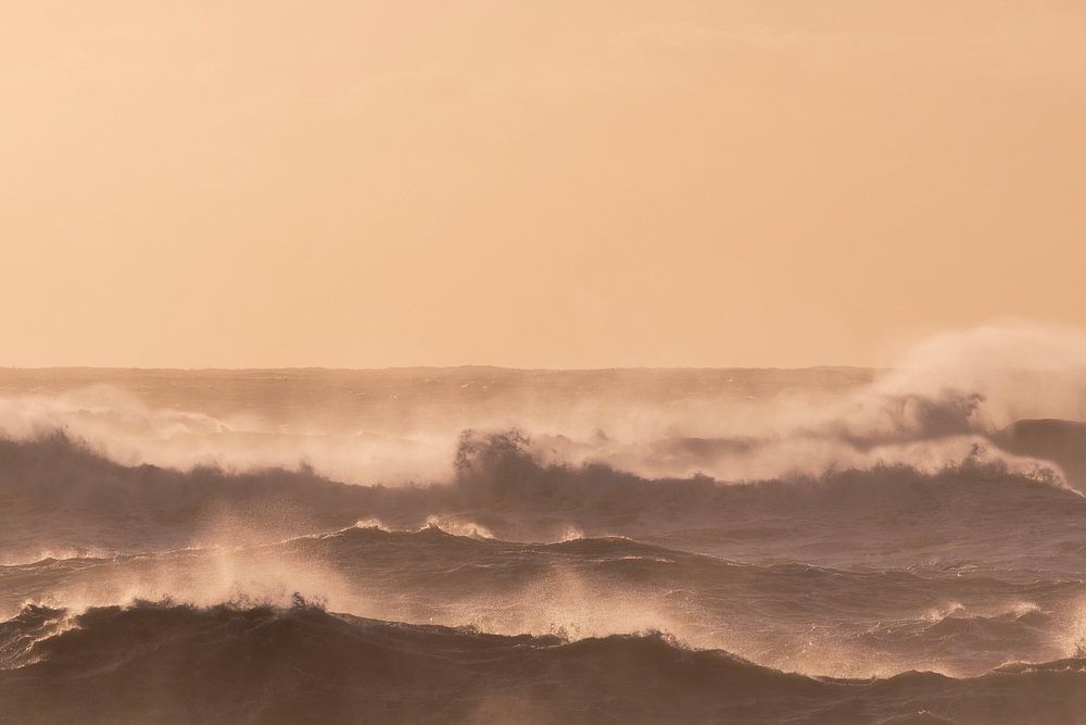 Deze krachtige en sfeervolle foto toont de dynamiek van de oceaan, vastgelegd in het warme, gouden licht van de schemering. De woeste golven, omgeven door nevelige spray, vormen een levendig contrast met de zachtheid van de lucht. Een eenzame vogel zweeft boven het kolkende water, wat een gevoel van vrijheid en grootsheid oproept. Perfect voor liefhebbers van maritieme en atmosferische kunst.