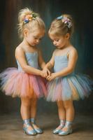 Twee jonge ballerina’s, gehuld in jurken van zachte regenboogtinten, vinden elkaar in een tedere stilte. Hun handen raken elkaar alsof ze een geheim delen dat alleen kinderen begrijpen. Het licht glijdt over hun tere huid en zet hun dromerige aanwezigheid in een bijna schilderachtige gloed. Het…