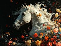 Deze afbeelding toont een sierlijk paard, schitterend in het wit, omringd door een dynamische bloemenwerveling. De manen van het paard lijken te dansen met de wind, omgeven door bloemen in levendige tinten van oranje, rood en geel tegen een diepzwarte achtergrond. De compositie straalt energie en beweging uit en zou een prachtig visueel…