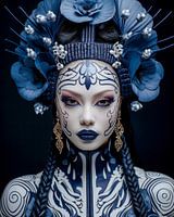 Dit indrukwekkende portret toont een majestueuze figuur die er zowel mystiek als krachtig uitziet. De vrouw draagt een uitgebreide hoofdtooi van blauwe bloemen, die symmetrisch zijn gerangschikt en haar gezicht omlijsten als een krans. De details van de bloemen, die versierd zijn met fijne metalen ornamenten, maken haar aanwezigheid…
