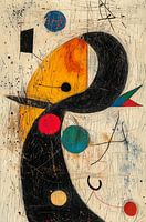 In deel drie van de serie Dans van de Hemellichamen zie je hoe kleurvlakken, zwarte krulvormen en spetterende lijnen elkaar ontmoeten in een wervelend universum. De heldere cirkels in rood, blauw, groen en geel lijken als planeten of energetische bolwerken rond een zwaartepunt te draaien.