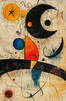 In dit fantasierijke abstracte werk lijken planeten, manen en sterren een speelse choreografie uit te voeren tegen een verweerd, textuurrijk canvas. De heldere kleuren – zoals vurig rood, diepblauw en zonnig geel – contrasteren prachtig met de krachtige zwarte vormen en fijne lijnen die als een visuele taal over het beeld…