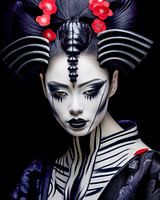 De mystieke geisha op het schilderij "Dance of the Shadow Geisha" straalt een krachtig aura uit dat balanceert tussen elegantie en duistere gratie. Haar gezicht is gehuld in smetteloos wit, terwijl dramatische zwarte lijnen die vloeien als inkt de contouren van haar ogen benadrukken. De kunstig gebogen haarstukjes, die doen denken aan…