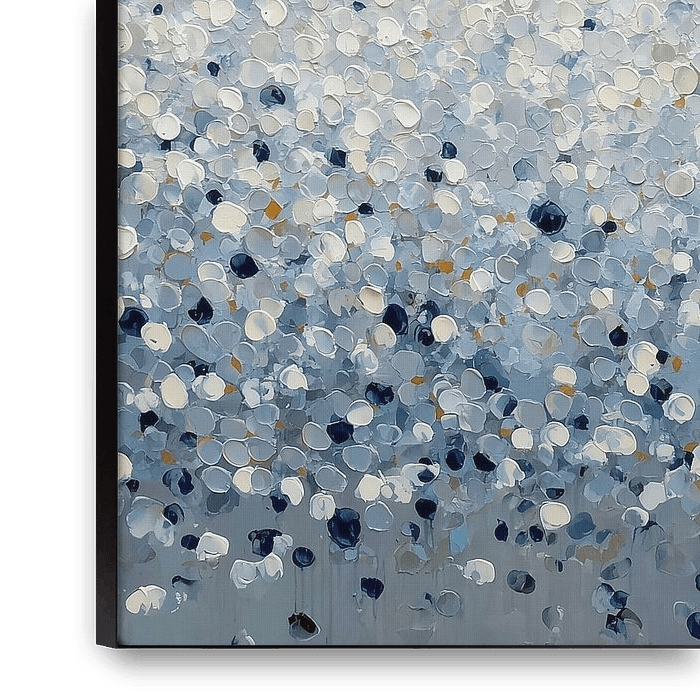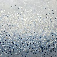 honderden kleine stippen, die samen een luchtige en ritmische compositie vormen. De achtergrond loopt van lichtgrijs bovenaan naar een iets donkerder grijs-blauw onderaan, waardoor de kleurintensiteit van de stippen subtiel verandert van boven naar beneden. De puntjes zijn voornamelijk wit, lichtgrijs, blauw, en af en toe warm beige of…