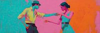 Dansen Vrouw Man | Dance Delight - Dit dans schilderij toont een man en vrouw die elegant met elkaar in verbinding staan, waarbij de vrouwelijke figuur een turquoise jurk draagt en de man gekleed is in een gele blouse, allemaal tegen een achtergrond van levendige kleuren zoals roze en oranje, wat een energieke en vrolijke sfeer…