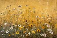 Dit rustgevende, trendy kunstwerk is een schitterende compositie van wilde bloemen tegen een gouden achtergrond, wat een warm en uitnodigend gevoel oproept.
